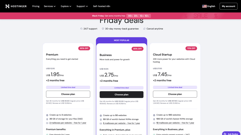 Hostinger’s shared hosting plans often start at just a few dollars per month. This is significantly lower than some competitors. Users can enjoy similar performance levels without breaking the bank.